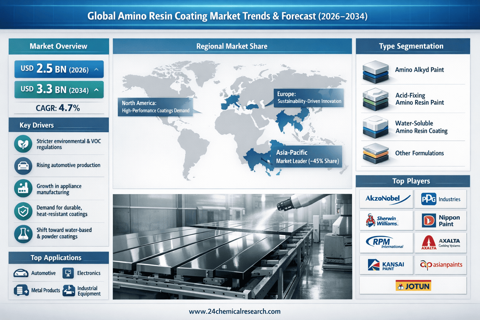 According to 24Chemical Research, Global Amino Resin Coating market was valued at USD 2.5 billion in 2026 and is projected to reach USD 3.3 billion by 2034, at a CAGR of 4.7% during the forecast period. This steady growth reflects increasing demand across automotive, electronics, and industrial applications where durable, heat-resistant coatings are essential.