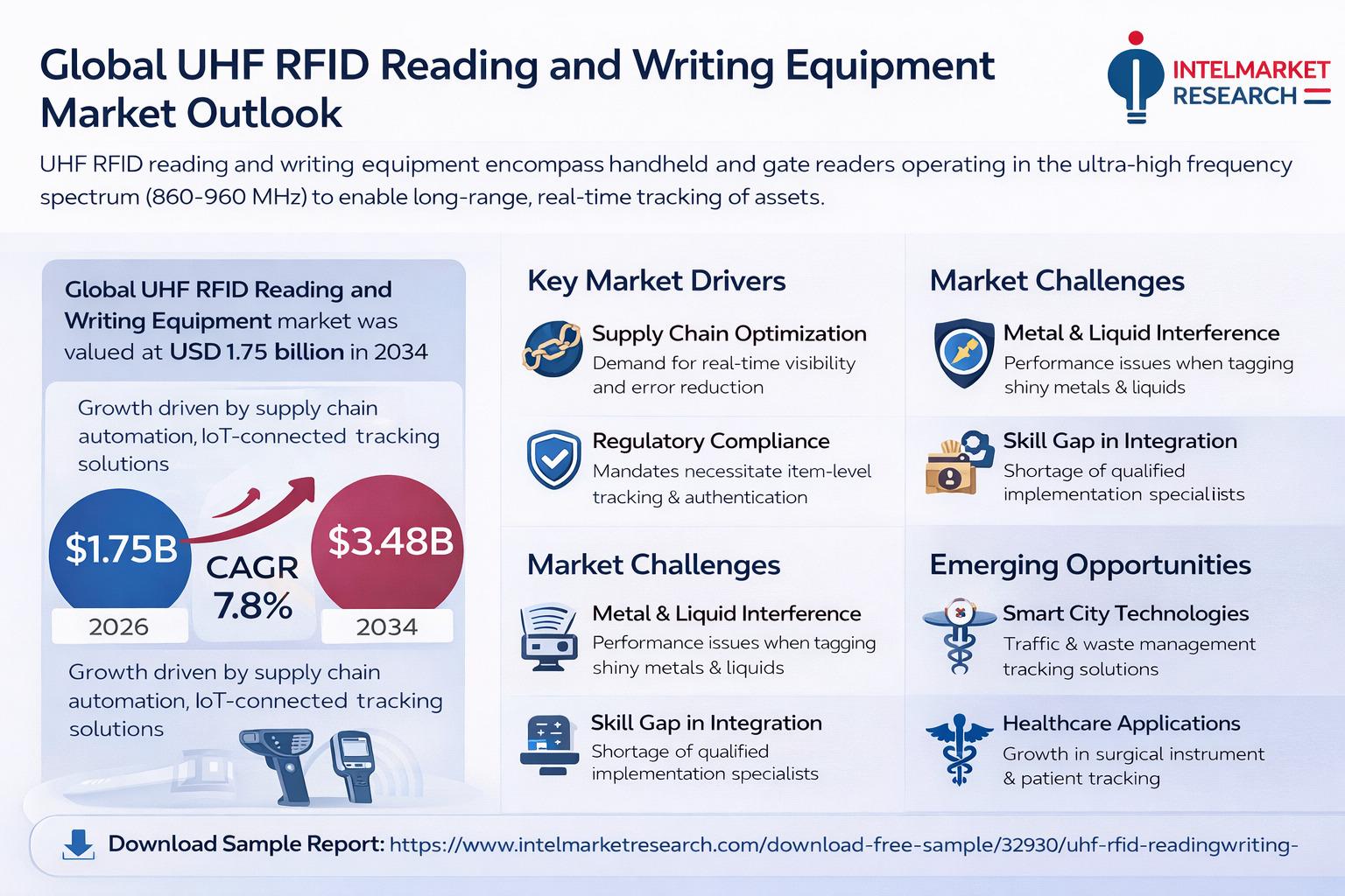 According to a new report from Intel Market Research, Global UHF RFID Reading and Writing Equipment market was valued at USD 1.75 billion in 2025 and is projected to reach USD 3.48 billion by 2034, growing at a steady CAGR of 7.8% during the forecast period (2026-2034). This growth is driven by increasing automation across industries, supply chain optimization needs, and the rising adoption of IoT-connected tracking solutions.