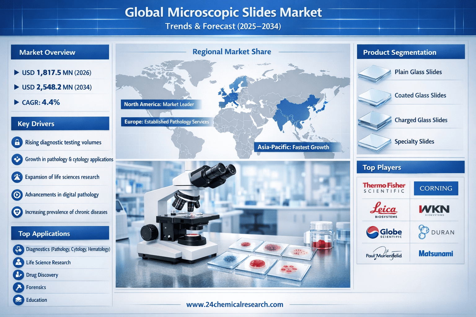 According to 24Chemical Research, Global Microscopic Slides Market continues to demonstrate steady growth, with its valuation reaching USD 1817.5 million in 2026 according to recent industry analysis. The market is projected to grow at a CAGR of 4.4%, reaching approximately USD 2548.2 million by 2034. This expansion is primarily driven by advancements in life sciences research, increasing diagnostic testing volumes, and technological innovations in microscopy techniques.
