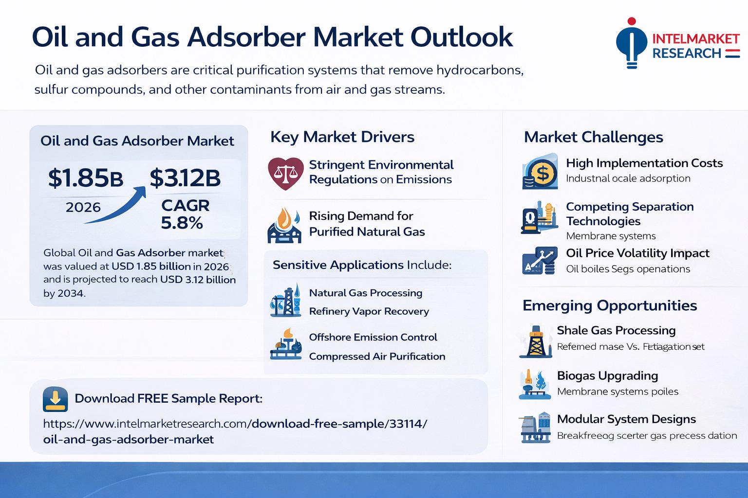 According to a new report from Intel Market Research, Global Oil and Gas Adsorber market was valued at USD 1.85 billion in 2025 and is projected to reach USD 3.12 billion by 2034, growing at a steady CAGR of 5.8% during the forecast period (2026-2034). This expansion comes as energy companies worldwide increasingly adopt adsorption technologies to meet tightening environmental regulations while maintaining operational efficiency.