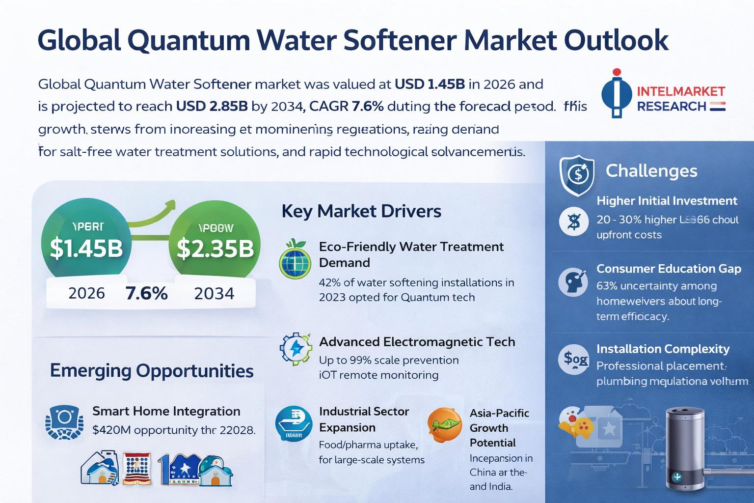 According to a new report from Intel Market Research, Global Quantum Water Softener market was valued at USD 1.45 billion in 2026 and is projected to reach USD 2.85 billion by 2034, growing at a steady CAGR of 7.6% during the forecast period. This growth stems from increasing environmental regulations, rising demand for salt-free water treatment solutions, and rapid technological advancements in electromagnetic water softening technologies.