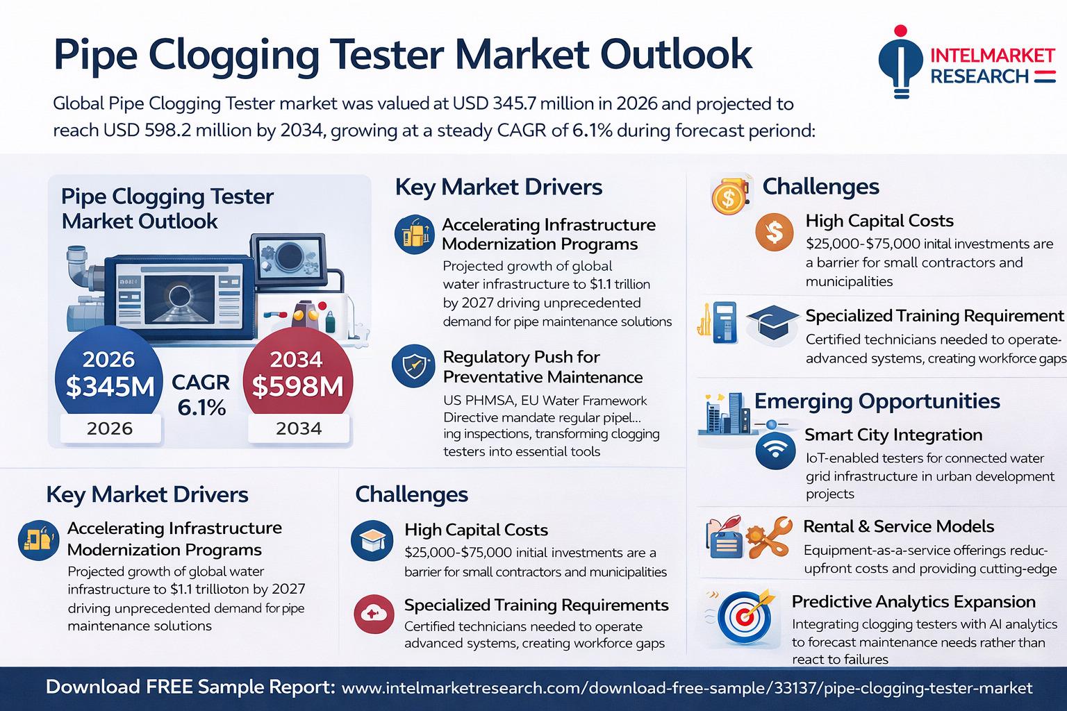 According to a new report from Intel Market Research, Global Pipe Clogging Tester market was valued at USD 345.7 million in 2025 and is projected to reach USD 598.2 million by 2034, growing at a steady CAGR of 6.1% during the forecast period (2026–2034). This growth is fueled by aging infrastructure requiring maintenance, urbanization driving new pipeline installations, and stringent environmental regulations mandating pipeline inspections.