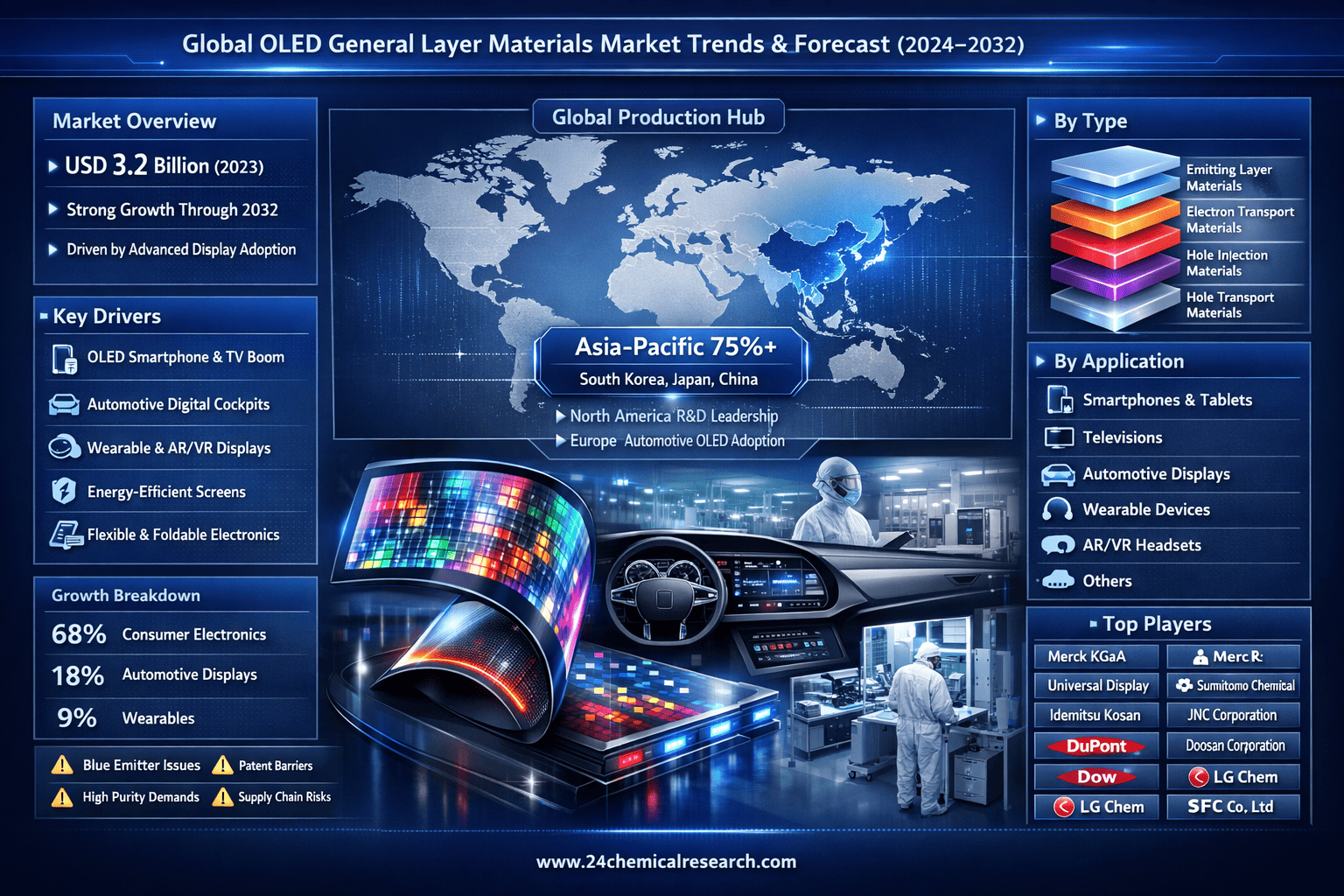 This comprehensive analysis covers the global OLED General Layer Materials market landscape from 2024 through 2032, providing detailed segmentation and regional breakdowns. The report delivers critical insights into: