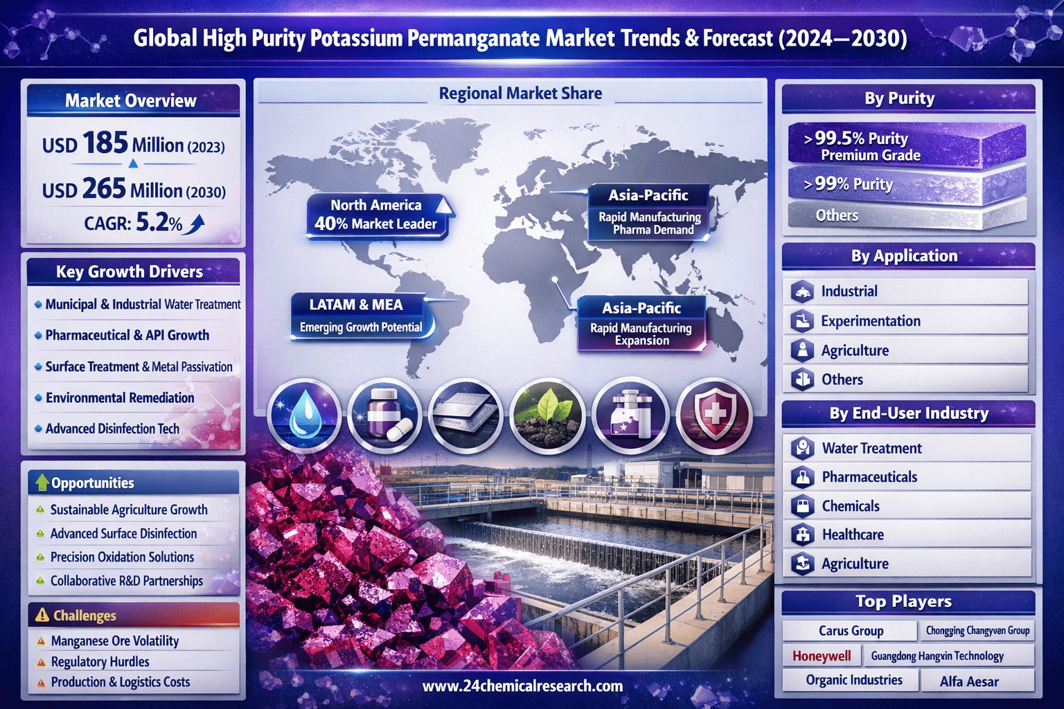 According to 24Chemical Research, Global High Purity Potassium Permanganate market was valued at USD 185 million in 2023 and is projected to reach USD 265 million by 2030, exhibiting a steady CAGR of 5.2% during the forecast period.