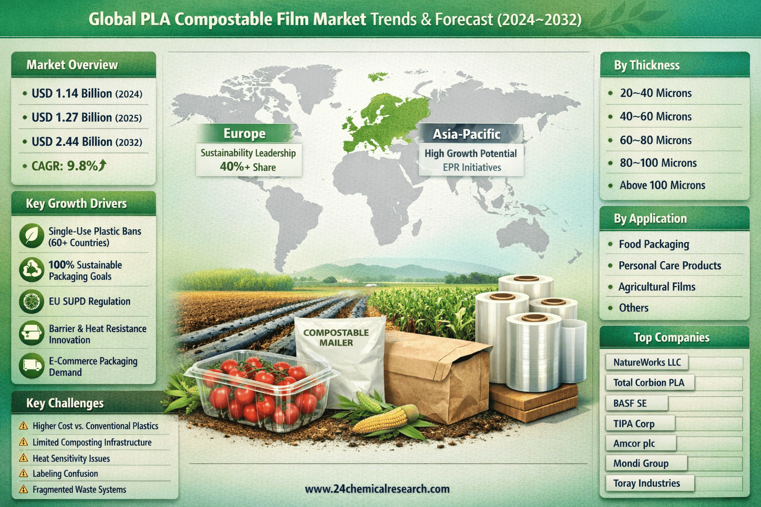 According to 24Chemical Research, Global PLA compostable film market size was valued at USD 1.14 billion in 2024. The market is projected to grow from USD 1.27 billion in 2025 to USD 2.44 billion by 2032, exhibiting a CAGR of 9.8% during the forecast period.