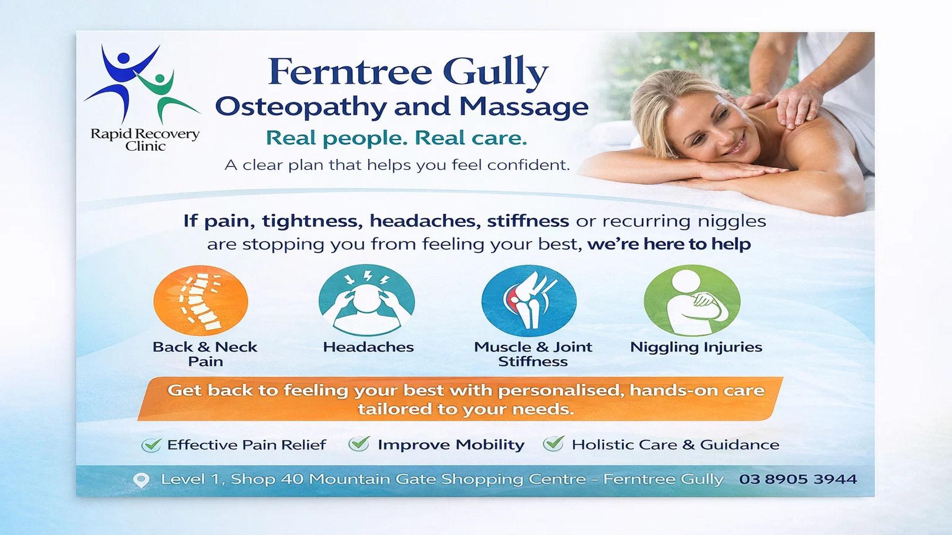 Explore more: https://rapidrecoveryclinic.com.au/locations/ferntree-gully-osteo-massage/