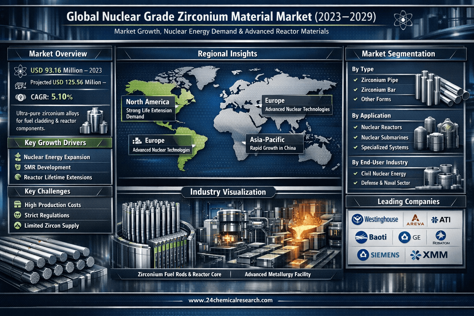 According to 24Chemical Research, Global Nuclear Grade Zirconium Material market was valued at USD 93.16 million in 2023 and is projected to reach USD 125.56 million by 2029, exhibiting a CAGR of 5.10% during the forecast period.