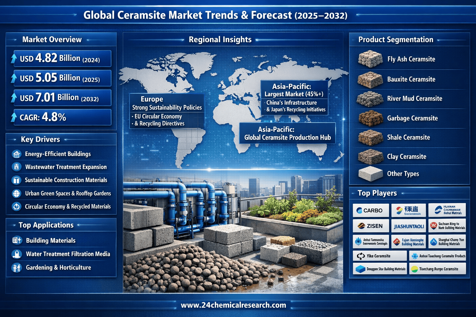 According to 24Chemical Research, Global Ceramsite market size was valued at USD 4.82 billion in 2024. The market is projected to grow from USD 5.05 billion in 2025 to USD 7.01 billion by 2032, exhibiting a CAGR of 4.8% during the forecast period. The influence of COVID-19 and the Russia-Ukraine War were considered while estimating market sizes.
