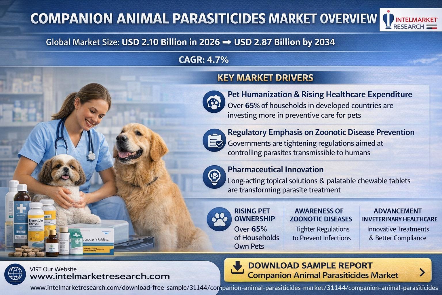 According to a new report from Intel Market Research, Global Companion Animal Parasiticides market was valued at USD 2.10 billion in 2025 and is projected to reach USD 2.87 billion by 2034, growing at a CAGR of 4.7% during the forecast period (2026-2034). This growth is driven by rising pet ownership, increasing awareness of zoonotic diseases, and advancements in veterinary healthcare.