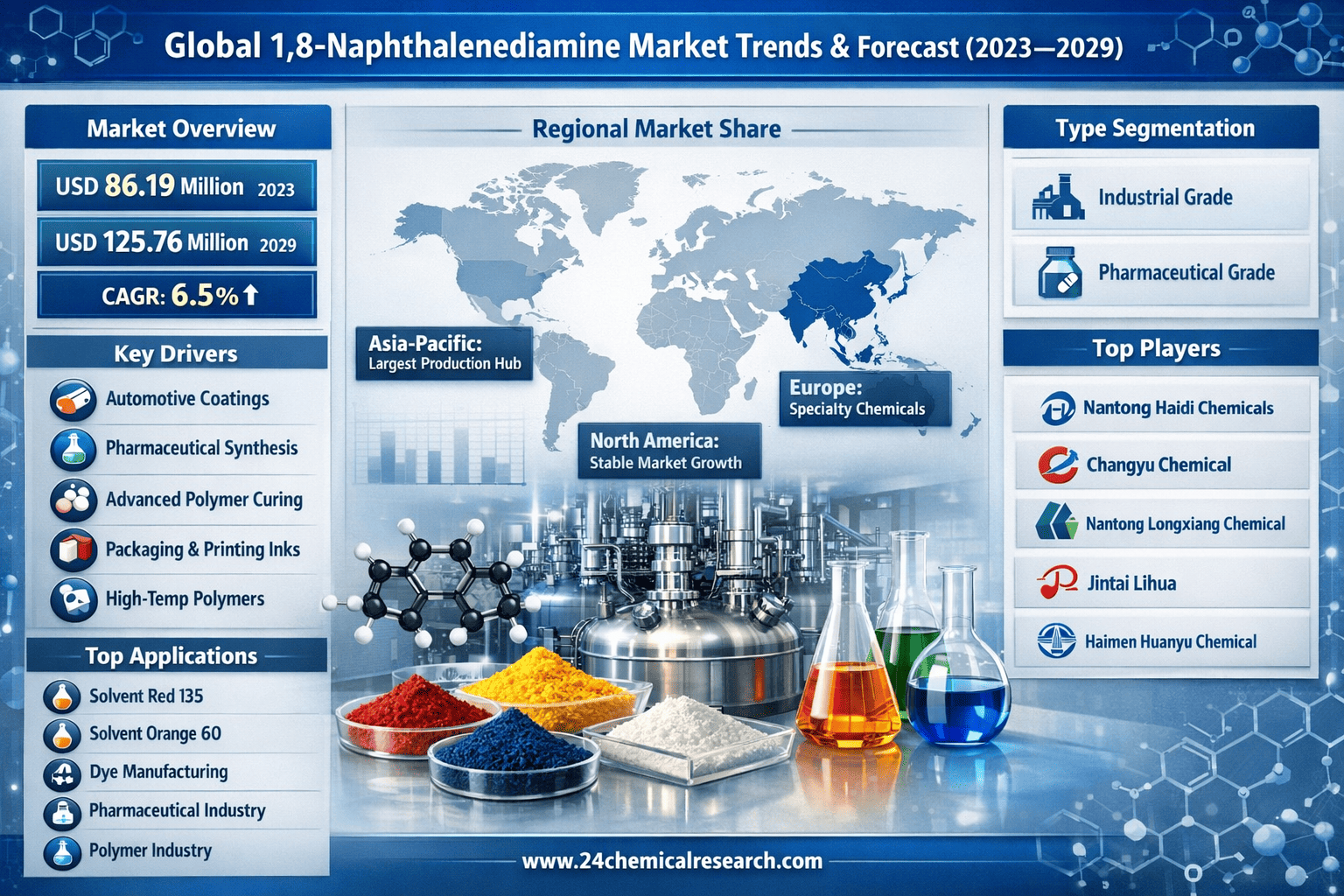 According to 24Chemical Research, Global 1,8-Naphthalenediamine Market Size was estimated at USD 86.19 million in 2023 and is projected to reach USD 125.76 million by 2029, exhibiting a CAGR of 6.50% during the forecast period.