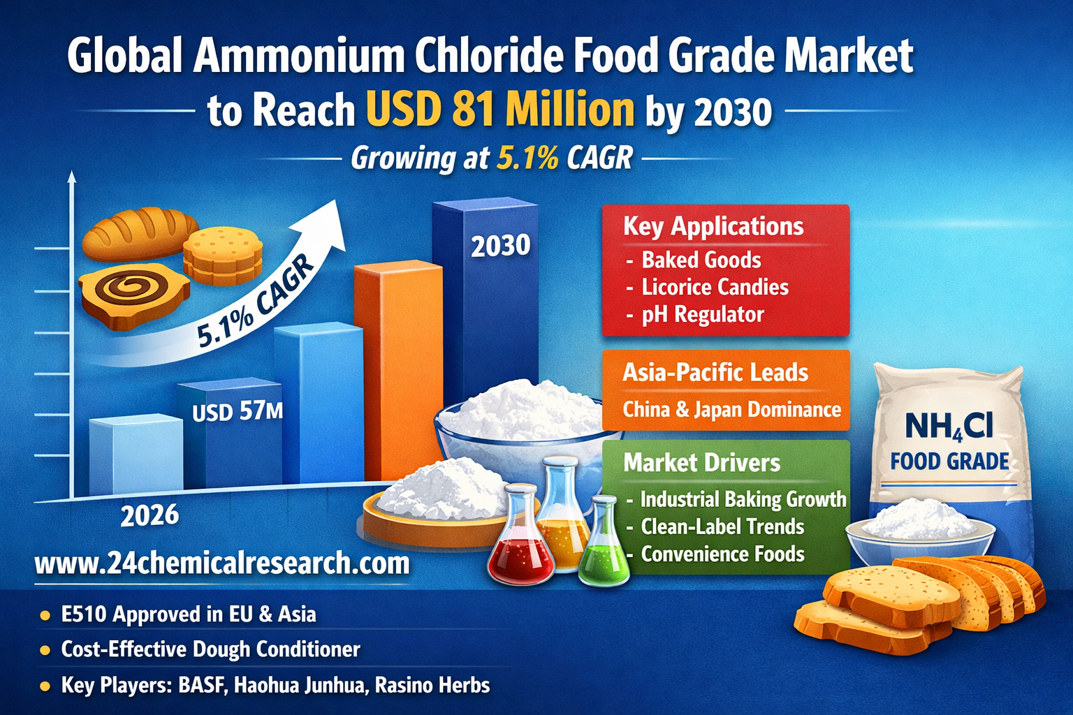 Global Ammonium Chloride Food Grade market is experiencing consistent expansion, with a valuation of USD 57 million in 2026 projected to reach USD 81 million by 2030, growing at a steady CAGR of 5.1%. This inorganic compound (NH4Cl) finds extensive application across food processing industries as an acidity regulator and dough conditioner, particularly in baked goods where it enhances texture and shelf life.