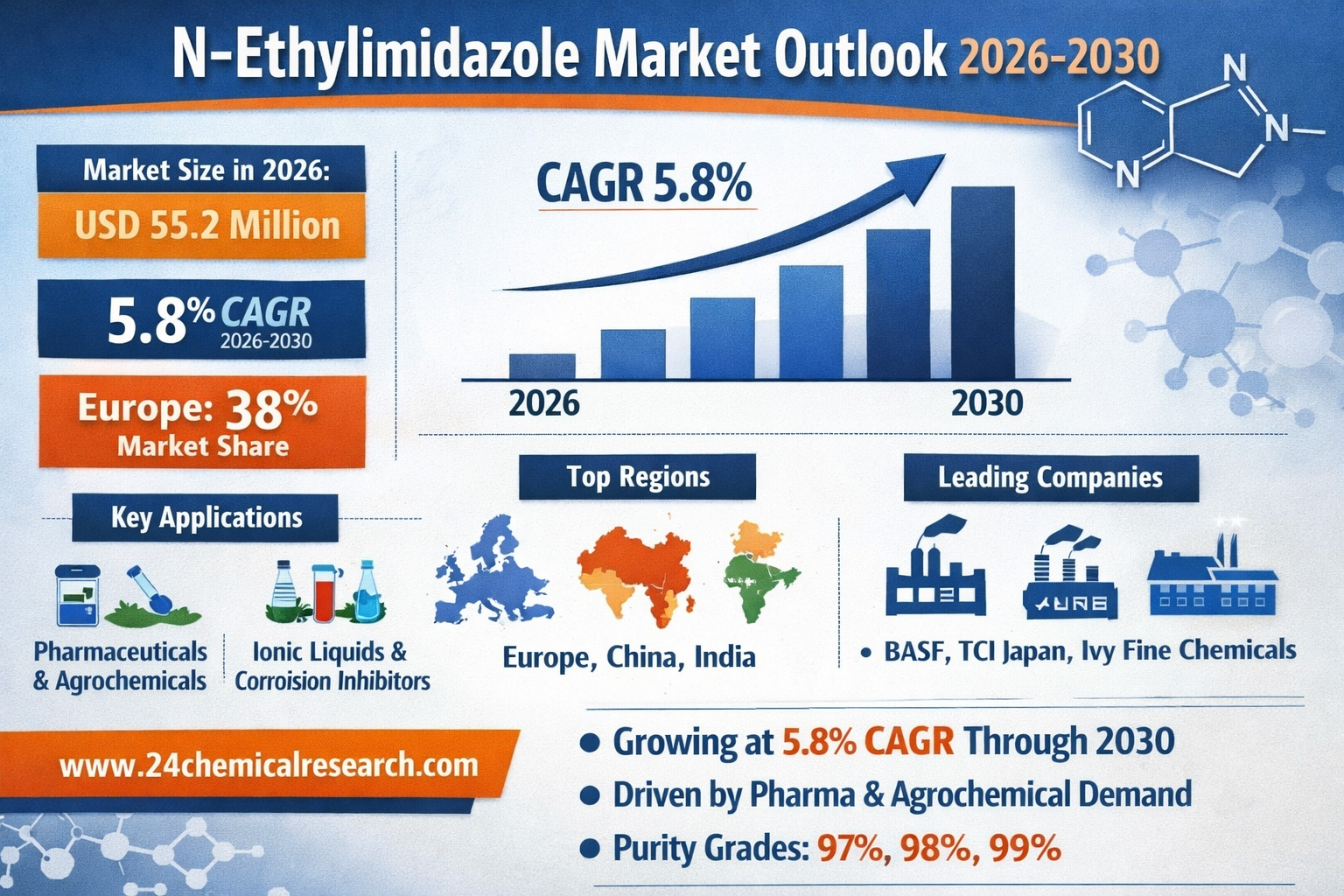 Global N-Ethylimidazole market demonstrates steady growth as a key chemical intermediate, valued at USD 55.2 million in 2026, with projections indicating a 5.8% CAGR through 2030. This organic compound, essential for pharmaceuticals, agrochemicals, and specialty chemicals, benefits from expanding applications in ionic liquids and corrosion inhibitors across multiple industries.