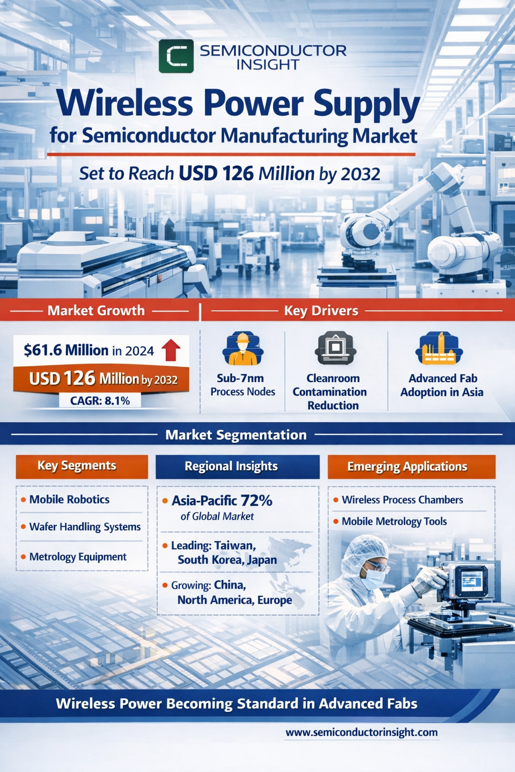 Wireless Power Supply (WPS) for Semiconductor Market, valued at USD 61.6 million in 2024, is poised for substantial expansion, projected to reach USD 126 million by 2032 with a compound annual growth rate (CAGR) of 8.1%. This growth trajectory is detailed in a comprehensive new report published by Semiconductor Insight, highlighting the critical role of wireless power solutions in enabling advanced semiconductor manufacturing processes while improving operational efficiency.