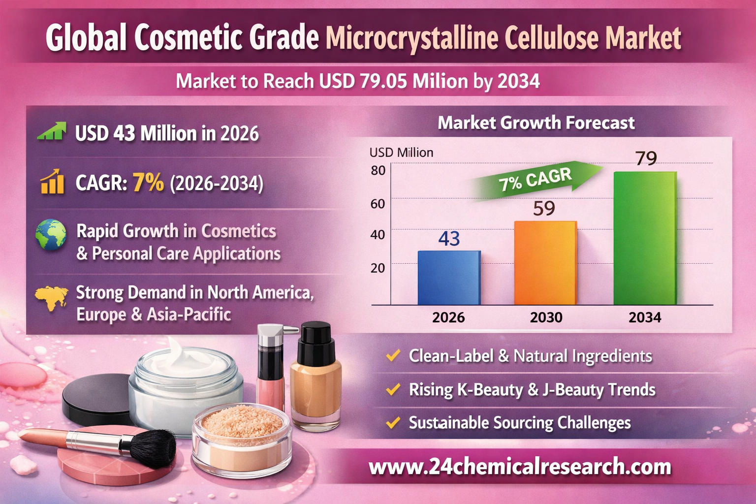 Global Cosmetic Grade Microcrystalline Cellulose Market continues to exhibit robust growth, with its valuation reaching USD 43 million in 2026. According to the latest market analysis, the sector is projected to expand at a CAGR of 7%, reaching approximately USD 79.05 million by 2034. This upward trajectory is primarily fueled by increasing applications in makeup formulations and personal care products, particularly in regions witnessing rapid urbanization and rising disposable incomes.