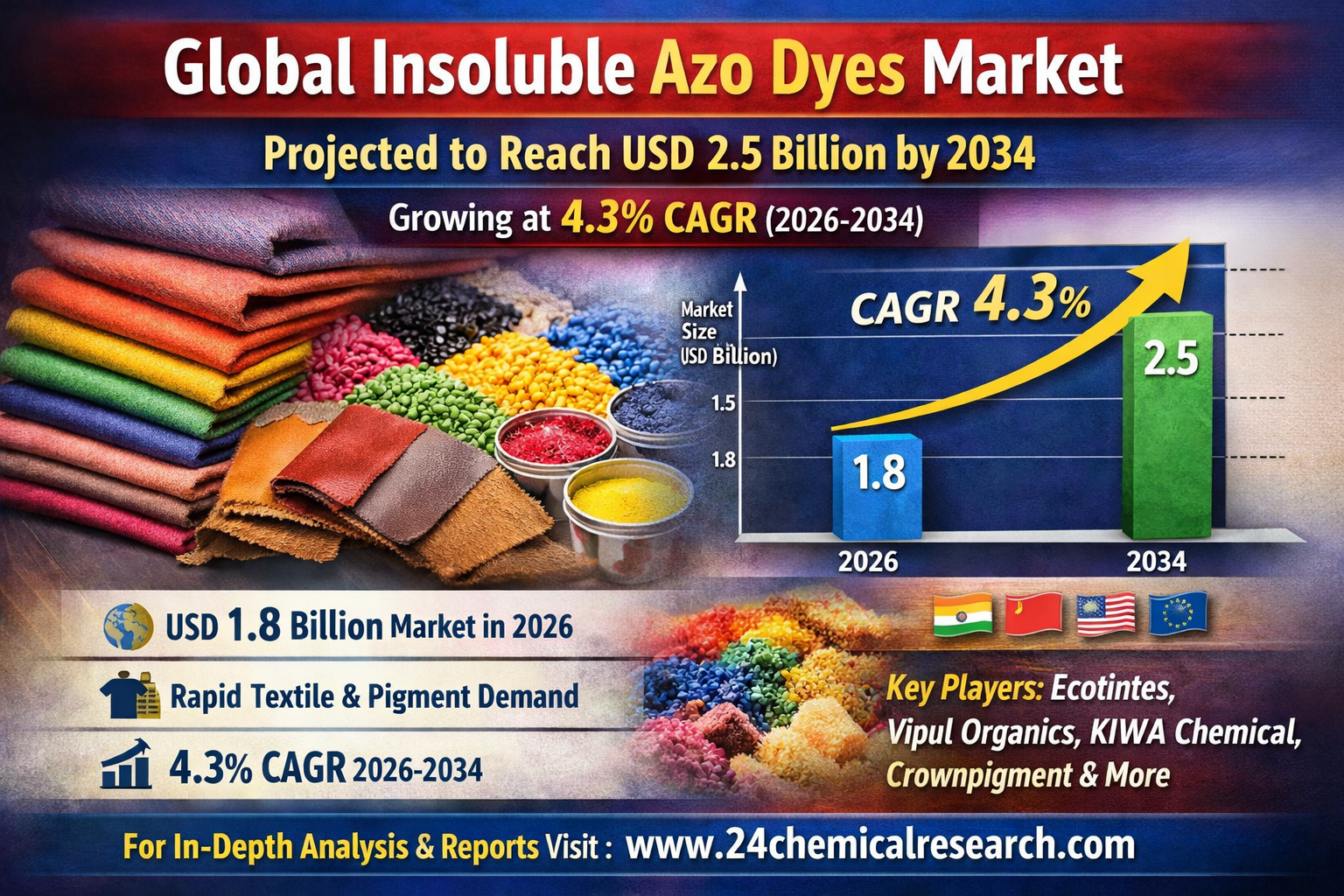 Global Insoluble Azo Dyes Market to Reach USD 2.5 Billion by 2034, Growing at 4.3% CAGR Amid Rising Textile and Pigment Demand