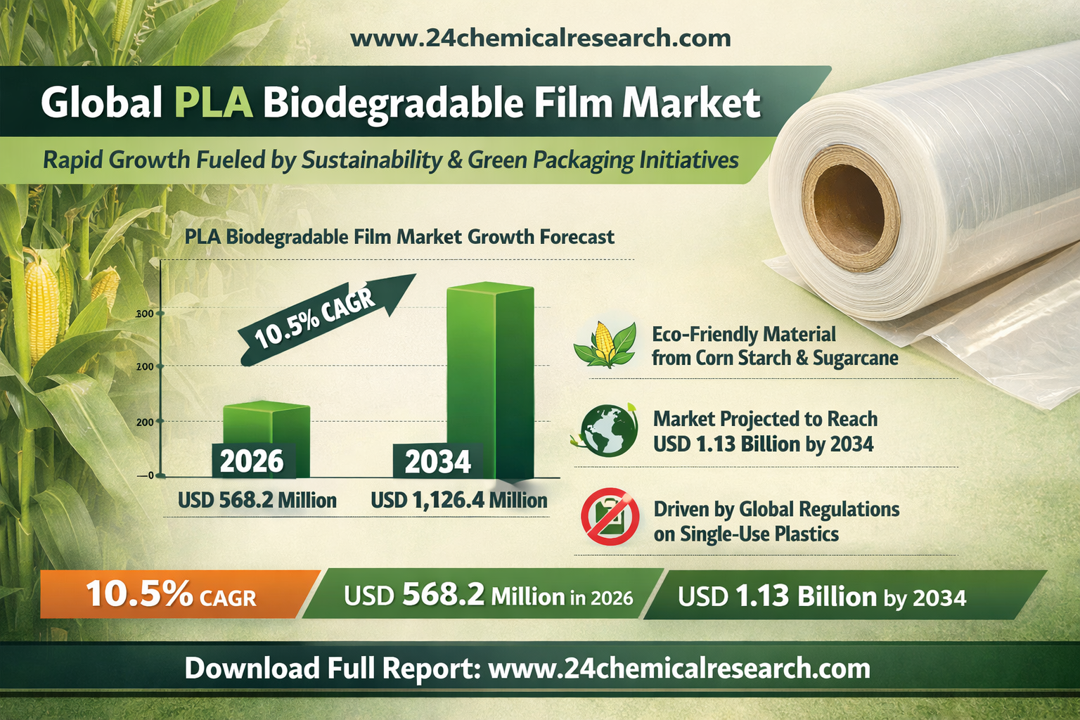 Global PLA Biodegradable Film market was valued at USD 568.2 million in 2026 and is projected to reach USD 1,126.4 million by 2034, exhibiting a robust CAGR of 10.5% during the forecast period.