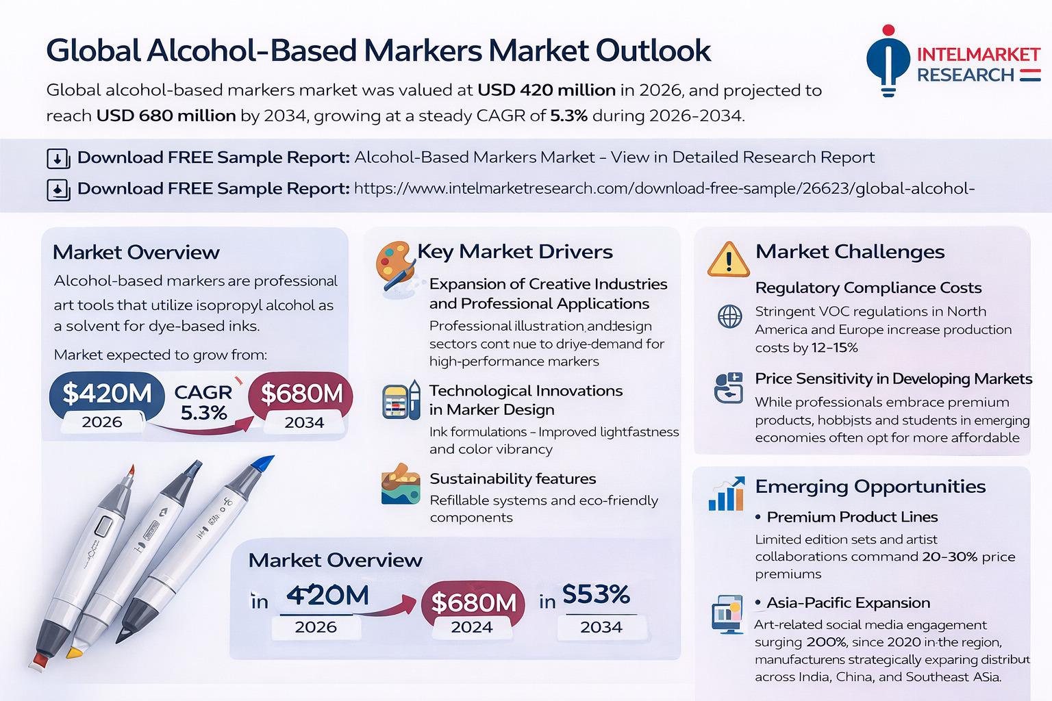 According to a new report from Intel Market Research, Global alcohol-based markers market was valued at USD 420 million in 2025 and is projected to reach USD 680 million by 2034, growing at a steady CAGR of 5.3% during the forecast period (2026-2034). This growth is fueled by rising demand in creative industries, expanding art education programs globally, and technological advancements in marker formulations.