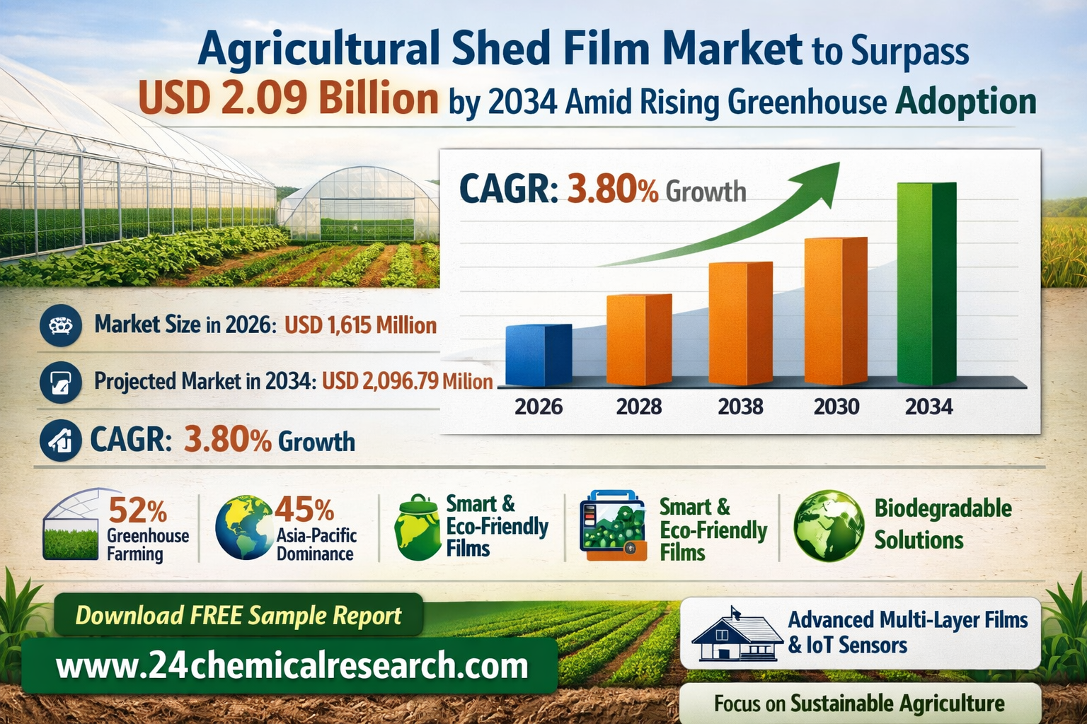 Global agricultural shed film market continues to demonstrate steady growth, with its valuation reaching USD 1,615 million in 2026. According to industry analysis, the market is projected to grow at a CAGR of 3.80%, reaching approximately USD 2,096.79 million by 2034. This growth is driven by expanding greenhouse farming and the need for climate-resilient agricultural solutions worldwide.