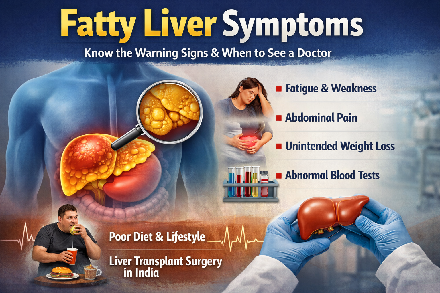 Know fatty liver symptoms, causes, and treatment. Learn when to consult a liver transplant surgeon in india for advanced care.