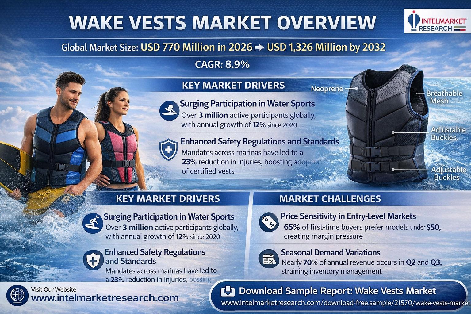 According to a new report from Intel Market Research, Global wake vests market was valued at USD 770 million in 2025 and is projected to reach USD 1,326 million by 2032, growing at a CAGR of 8.9% during the forecast period (2026–2032). This growth is propelled by increasing participation in water sports, rising awareness about safety equipment, and technological advancements in materials like neoprene and breathable mesh.