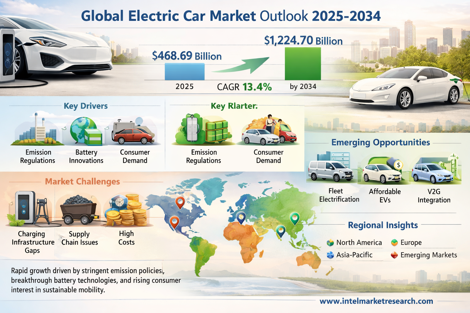 According to a comprehensive report from Intel Market Research, the global electric car market was valued at USD 468.69 billion in 2025 and is projected to reach USD 1,224.70 billion by 2034, registering an impressive CAGR of 13.4% during the forecast period (2026–2034). This exponential growth is fueled by regulatory mandates for emission reductions, technological advancements in battery systems, and shifting consumer preferences toward sustainable mobility solutions.