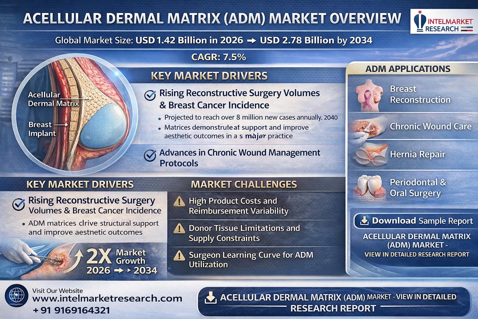 According to a new report from Intel Market Research, Global Acellular Dermal Matrix (ADM) market was valued at USD 1.42 billion in 2025 and is projected to reach USD 2.78 billion by 2034, growing at a CAGR of 7.5% during the forecast period (2026–2034). This growth is fueled by increasing reconstructive surgery volumes, advancements in wound care technologies, and rising adoption of biological matrices over synthetic alternatives.