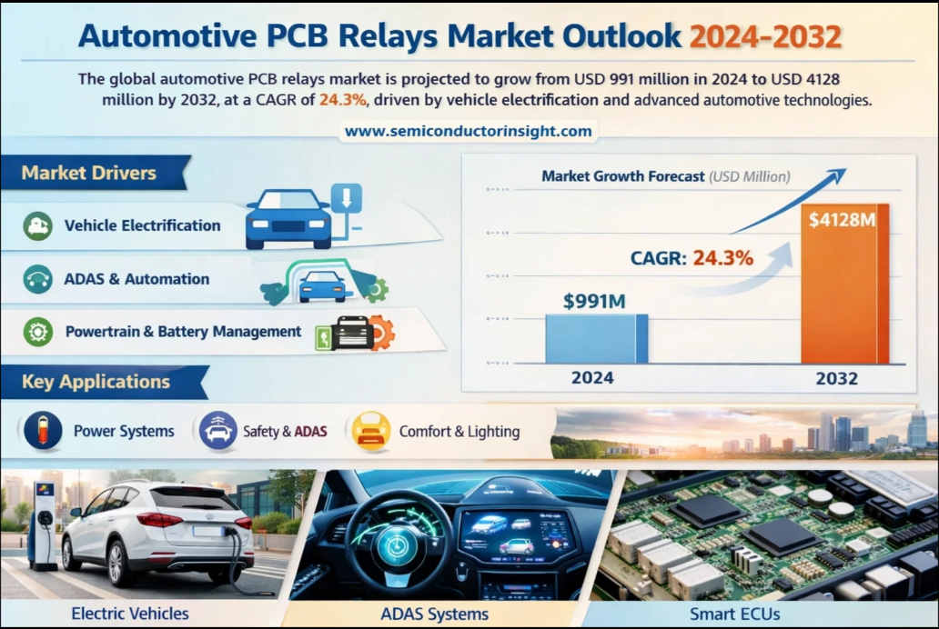 Global Automotive PCB Relays Market was valued at USD 991 million in 2024 and is projected to reach USD 4128 million by 2032, exhibiting a CAGR of 24.3% during the forecast period, as detailed in a comprehensive new report published by Semiconductor Insight. The study underscores the indispensable role these electromechanical switching components play in managing electrical loads across modern vehicle systems, from engine control units to advanced driver-assistance systems (ADAS).