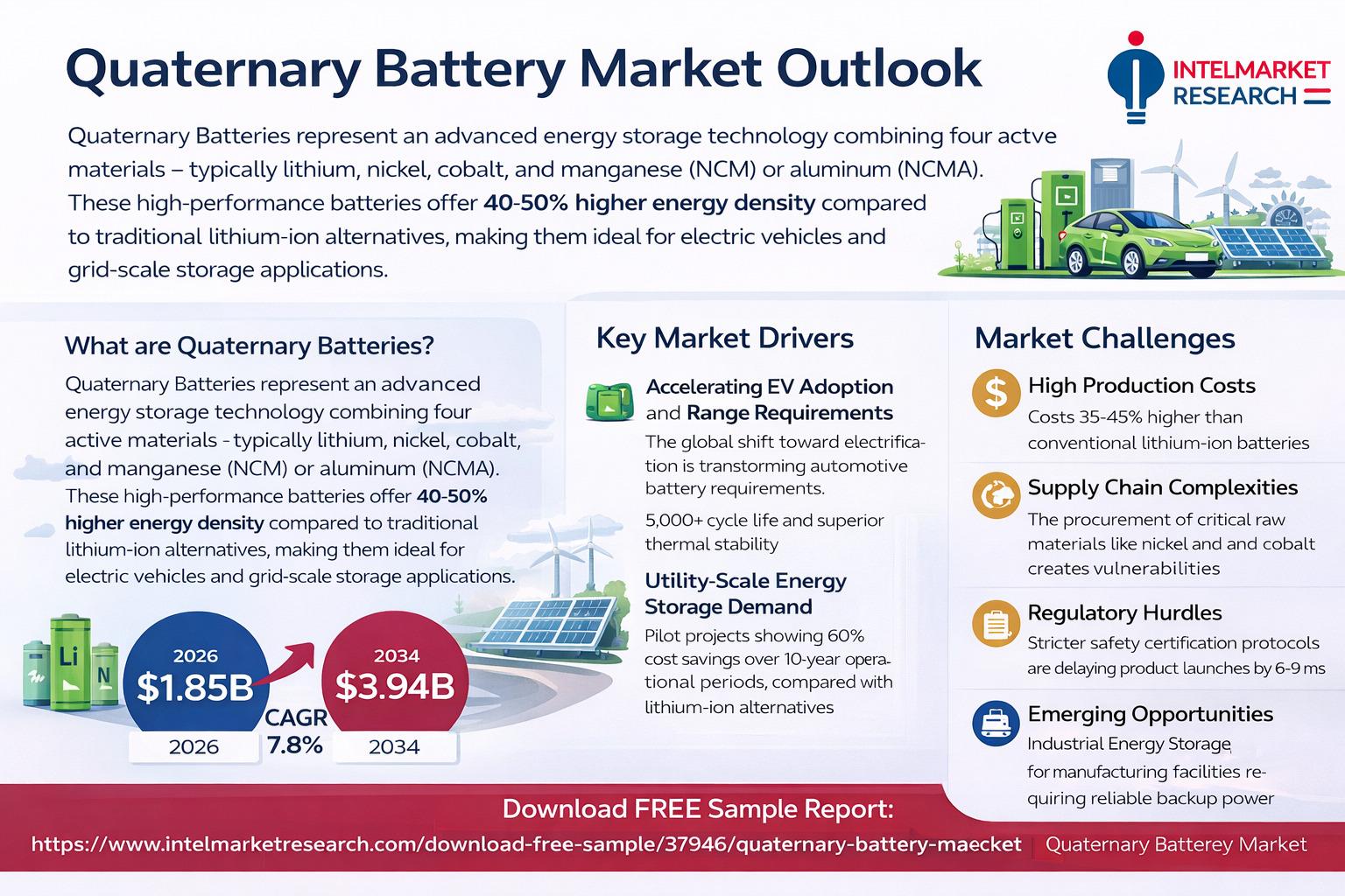 According to a new report from Intel Market Research, Global Quaternary Battery market was valued at USD 1.85 billion in 2025 and is projected to reach USD 3.94 billion by 2034, growing at a CAGR of 7.8% during the forecast period (2026-2034). This growth is fueled by accelerating EV adoption worldwide and increasing demand for high-energy-density storage solutions in renewable energy systems.
