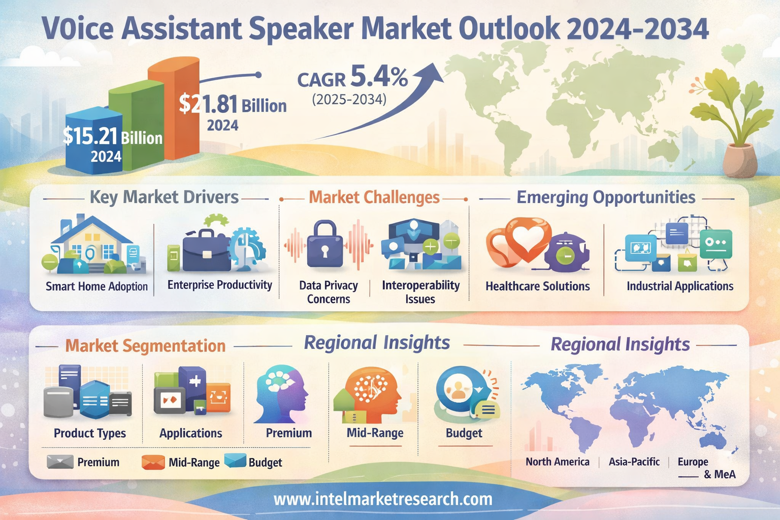 According to a new market intelligence report from Intel Market Research, the global voice assistant speaker market was valued at USD 15.21 billion in 2024 and is projected to reach USD 21.81 billion by 2034, growing at a CAGR of 5.4% during the forecast period (2025-2034). This growth trajectory reflects the accelerating adoption of AI-powered voice technologies across residential, commercial and healthcare sectors worldwide.