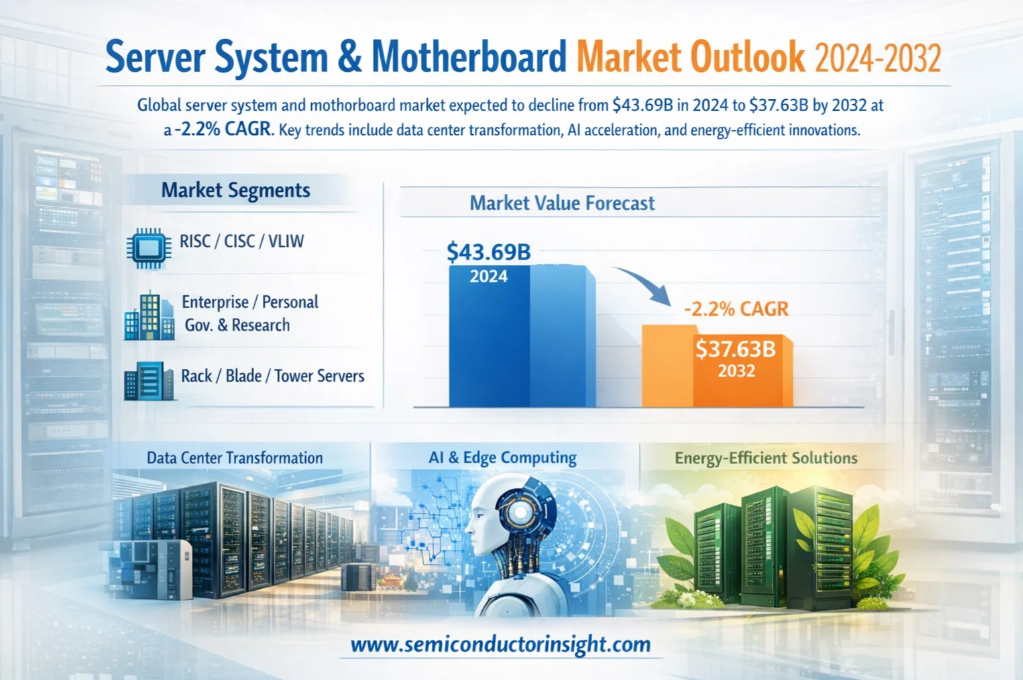 Global Server System and Server Motherboard Market, valued at US$ 43,690 million in 2024, is undergoing market consolidation with projections indicating a decline to US$ 37,630 million by 2032, reflecting a compound annual decline rate (CAGR) of -2.2%. This market contraction is detailed in a comprehensive new report published by Semiconductor Insight, highlighting the evolving dynamics of enterprise computing infrastructure amid changing technological and economic conditions.