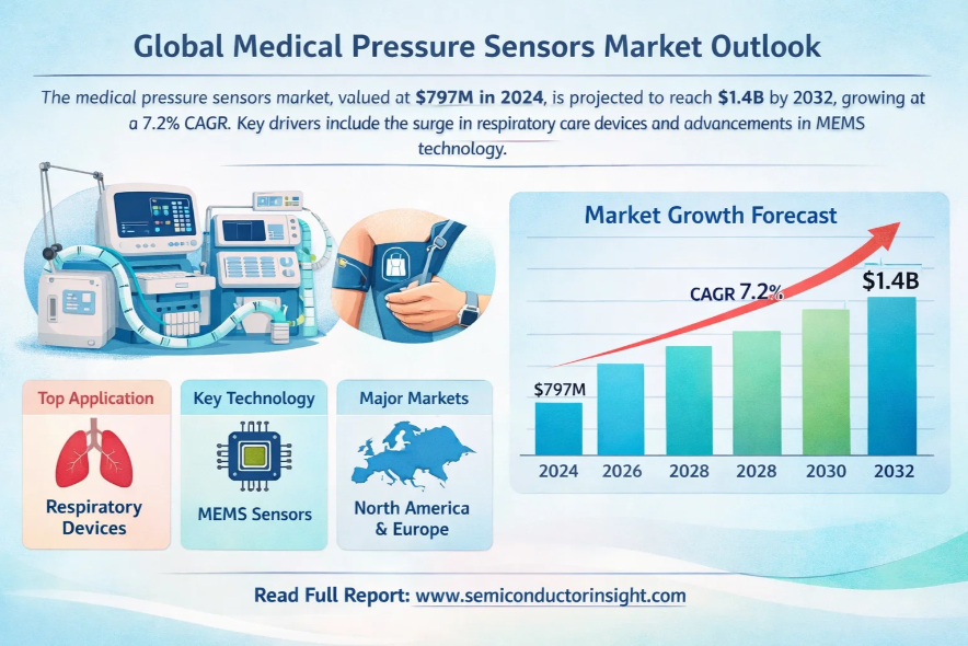 Global Medical Pressure Sensors Market, valued at approximately $797 million in 2024, is poised for substantial growth, projected to reach $1.4 billion by 2032. This expansion, representing a compound annual growth rate (CAGR) of 7.2%, is detailed in a comprehensive new report published by Semiconductor Insight. The study underscores the critical role these precision components play in modern healthcare systems, enabling accurate monitoring and control across various medical applications.