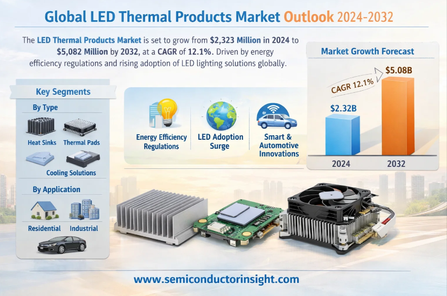 Global LED Thermal Products Market, valued at a robust US$ 2,323 million in 2024, is on a trajectory of significant expansion, projected to reach US$ 5,082 million by 2032. This growth, representing a compound annual growth rate (CAGR) of 12.1%, is detailed in a comprehensive new report published by Semiconductor Insight. The study highlights the critical role of these specialized thermal management devices in ensuring performance, reliability, and longevity of LED lighting systems across various applications.
