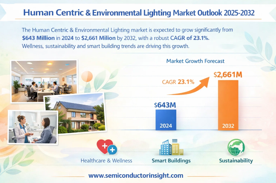 Global Human Centric Lighting and Environmental Lighting Market, valued at US$ 643 million in 2024, is poised for remarkable expansion, projected to reach US$ 2,661 million by 2032. This robust growth, representing a compound annual growth rate (CAGR) of 23.1%, is detailed in a comprehensive new report published by Semiconductor Insight. The study underscores the transformative role of these advanced lighting solutions in enhancing human well-being, productivity, and environmental sustainability across various sectors.