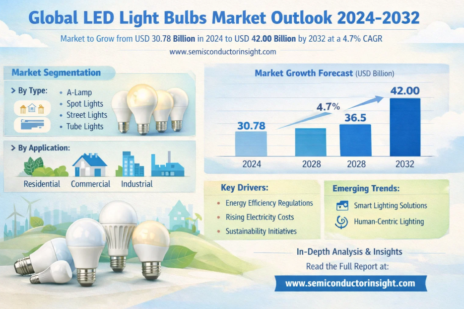 Global LED Light Bulbs Market, valued at a robust US$ 30,780 million in 2024, is on a trajectory of steady expansion, projected to reach US$ 42,000 million by 2032. This growth, representing a compound annual growth rate (CAGR) of 4.7%, is detailed in a comprehensive new report published by Semiconductor Insight. The study highlights the critical role of these energy-efficient lighting solutions in reducing global electricity consumption and supporting sustainability initiatives across residential, commercial, and industrial sectors.