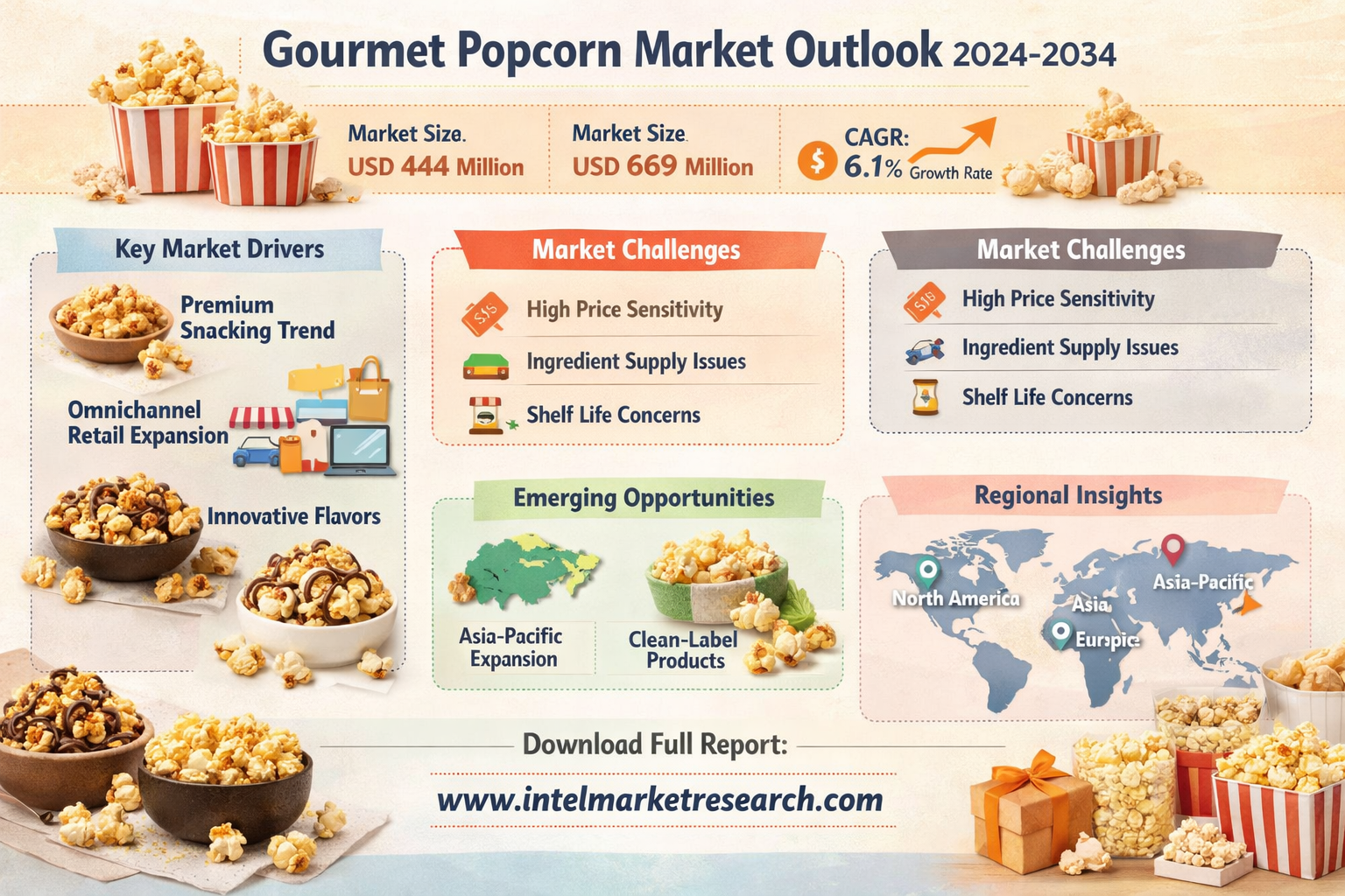 According to a new report from Intel Market Research, the global gourmet popcorn market was valued at USD 444 million in 2024 and is projected to reach USD 669 million by 2034, growing at a CAGR of 6.1% during the forecast period. This growth is driven by increasing consumer preference for premium snack alternatives, innovative flavor profiles, and expanding retail distribution channels.