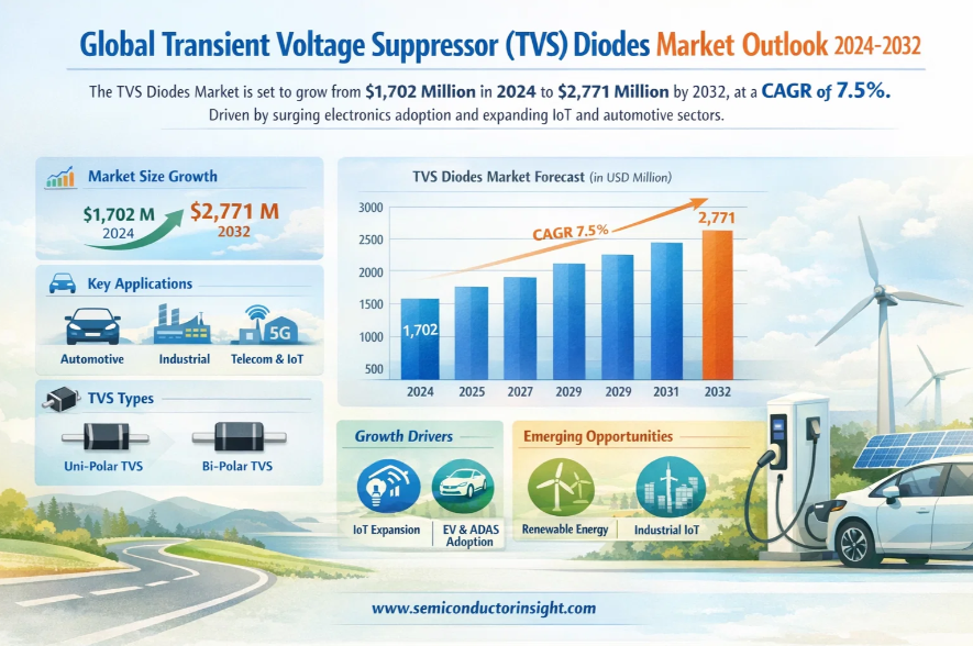 Global Transient Voltage Suppressor (TVS) Diodes Market, valued at a substantial US$ 1,702 million in 2024, is poised for significant expansion, projected to reach US$ 2,771 million by 2032. This growth, representing a compound annual growth rate (CAGR) of 7.5%, is detailed in a comprehensive new report published by Semiconductor Insight. The study underscores the indispensable role of these critical circuit protection components in safeguarding sensitive electronics from voltage transients and electrostatic discharge (ESD) across virtually all modern industries.