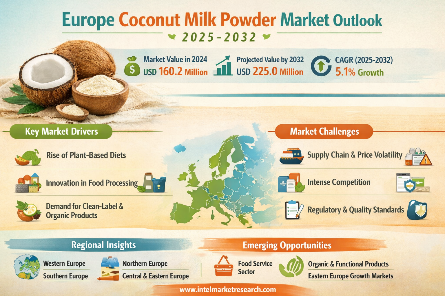 According to a new report from Intel Market Research, the Europe Coconut Milk Powder Market was valued at USD 160.2 million in 2024 and is projected to reach USD 225.0 million by 2032, growing at a steady CAGR of 5.1% during the forecast period (2025–2032). This growth is driven by the rising popularity of plant-based and vegan diets, increasing consumer demand for clean-label ingredients, and the product's superior shelf stability and logistical advantages over liquid coconut milk.