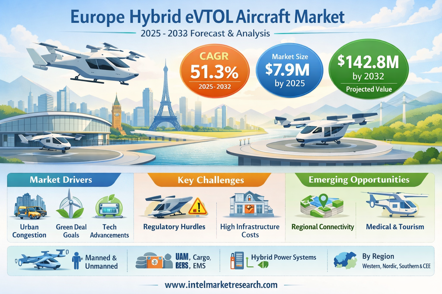 According to a new report from Intel Market Research, the Europe Hybrid eVTOL Aircraft Market was valued at USD 4.8 million in 2024 and is projected to grow from USD 7.9 million in 2025 to USD 142.8 million by 2032, exhibiting a remarkable CAGR of 51.3% during the forecast period (2025–2032). This extraordinary growth trajectory is driven by escalating urban congestion across major European metropolitan centers, the continent's ambitious decarbonization agenda under the European Green Deal, and rapid advancements in hybrid-electric propulsion technologies that overcome the range limitations inherent in purely battery-powered alternatives.