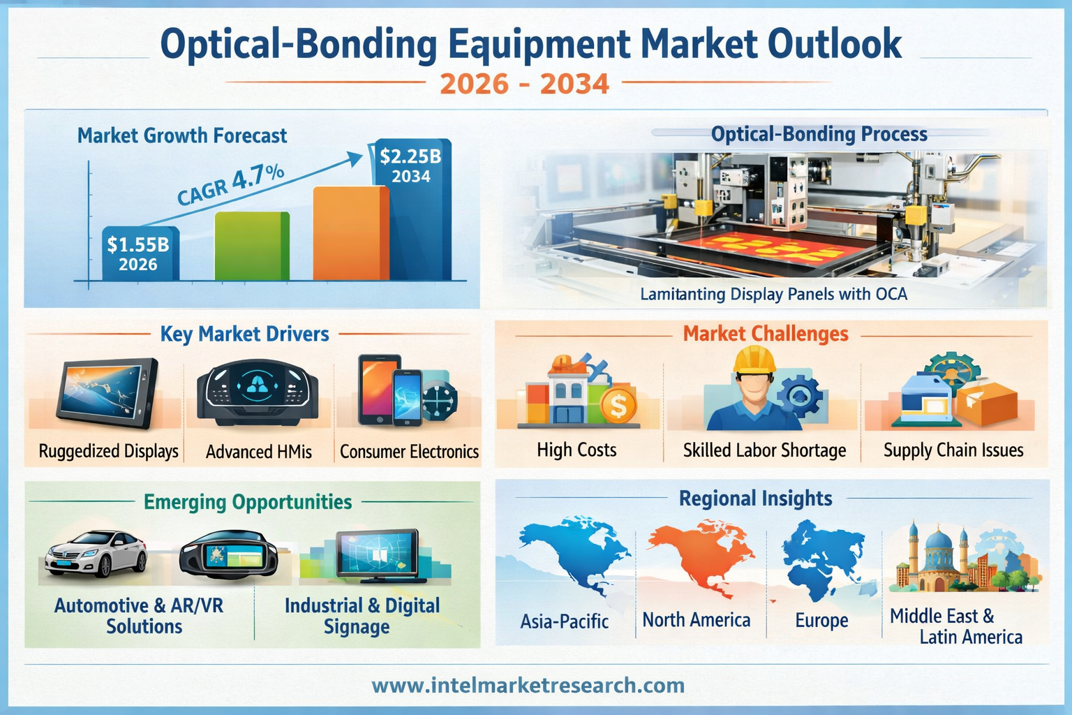 According to a new report from Intel Market Research, the global Optical-bonding Equipment market was valued at USD 1.45 billion in 2025 and is projected to grow from USD 1.55 billion in 2026 to USD 2.25 billion by 2034, exhibiting a CAGR of 4.7% during the forecast period (2026–2034). This growth is propelled by the rising demand for high-quality displays in automotive infotainment systems and advanced consumer electronics such as smartphones, tablets, and wearables. Furthermore, stringent requirements for sunlight readability and ruggedness in industrial and military applications are propelling adoption.
