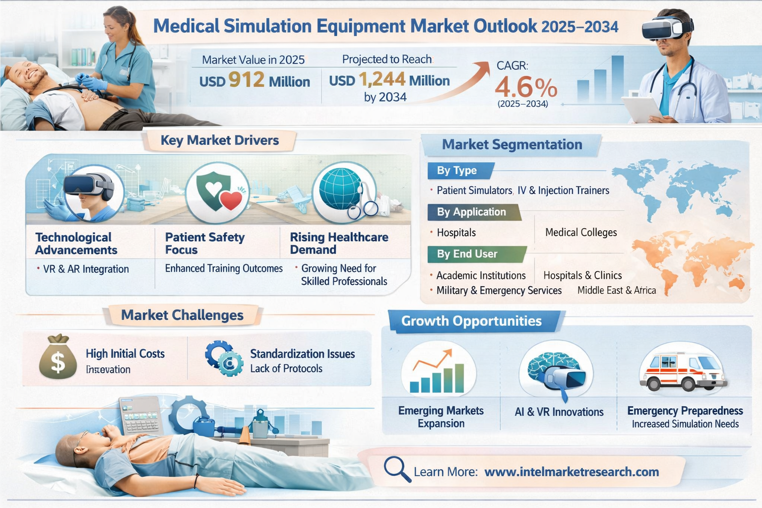According to a new report from Intel Market Research, the global Medical Simulation Equipment market was valued at USD 912 million in 2025 and is projected to grow from USD 953.95 million in 2026 to USD 1,244 million by 2034, exhibiting a CAGR of 4.6% during the forecast period (2025–2034). This growth is propelled by rising global demand for skilled healthcare professionals, increasing adoption of simulation-based learning in medical institutions, and growing emphasis on patient safety.