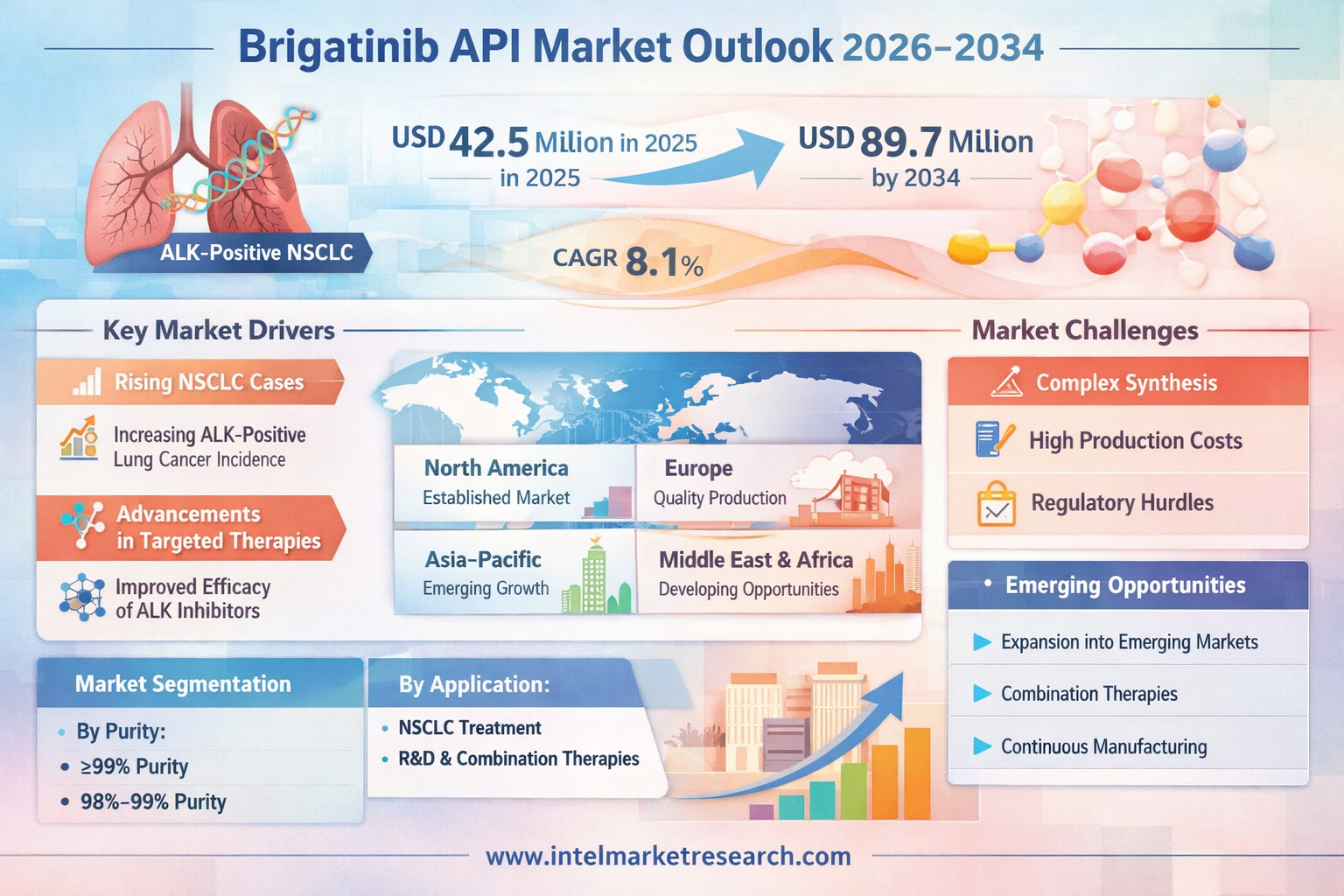 Collectively, these factors are expected to enhance accessibility, stimulate innovation, and drive Brigatinib API’s penetration across new geographies and indications.