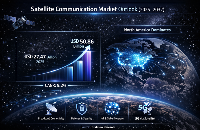 The Satellite Communication Market was USD 25.06 billion in 2024. Stratview Research projects it will reach USD 50.86 billion in 2032, with USD 27.47 billion expected in 2025.
