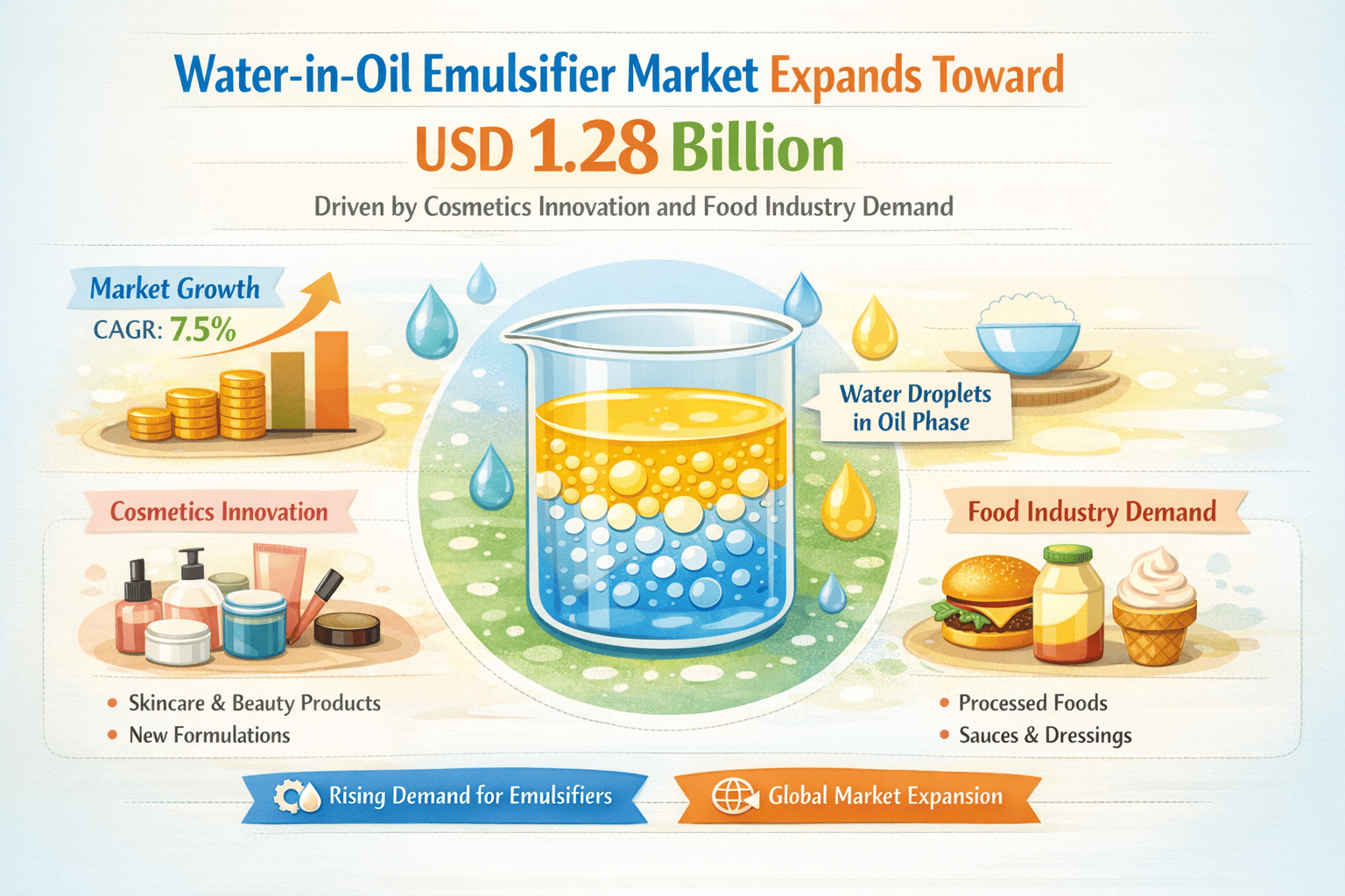 Water-in-Oil Emulsifier Market Expands Toward USD 1.28 Billion Driven by Cosmetics Innovation and Food Industry Demand
