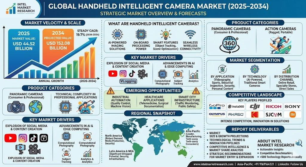According to a new report from Intel Market Research, the global handheld intelligent camera market was valued at USD 44.52 billion in 2025 and is projected to reach USD 152.08 billion by 2034, growing at an impressive CAGR of 19.7% during the forecast period (2026-2034). This substantial growth trajectory is fueled by the widespread adoption of AI-powered imaging solutions, expansion of social media content creation, and increasing demand for high-quality portable camera systems across multiple industries.