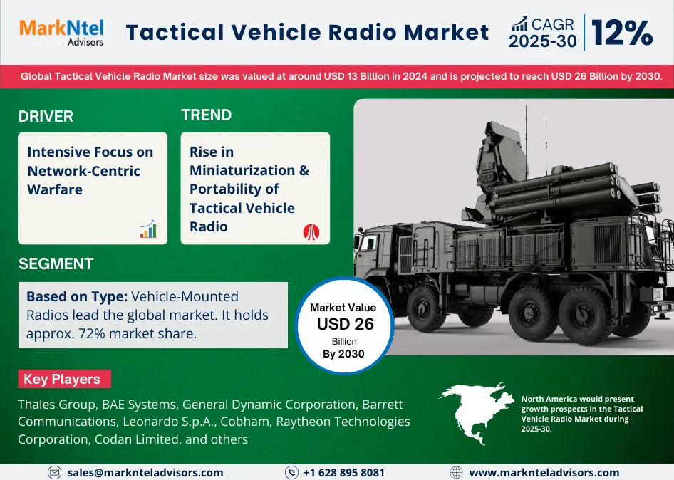 According to MarkNtel Advisors study The future of Global Tactical Vehicle Radio Market size was valued at around USD 13 Billion in 2024 and is projected to reach USD 26 Billion by 2030. Along with this, the market is estimated to grow at a CAGR of around 12% during the forecast period (2025-30).