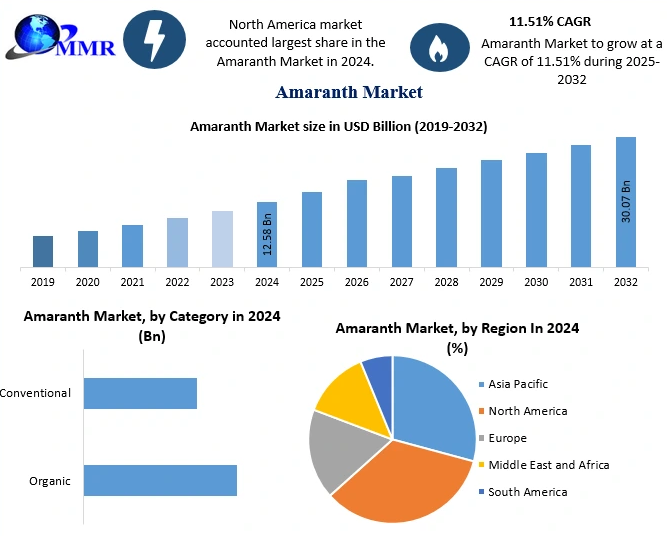 The Amaranth Market was valued at USD 12.58 billion in 2024 and is projected to reach nearly USD 30.07 billion by 2032, growing at a CAGR of 11.51% during the forecast period (2025–2032). Amaranth, a pseudocereal similar to wheat, barley, and oats, is rich in vitamins, fiber, minerals, antioxidants, and other nutrients. Its health benefits include improved metabolism, reduced inflammation, lower cholesterol, enhanced digestion, and overall wellness, making it highly versatile across food, beverages, personal care, cosmetics, and pharmaceuticals.