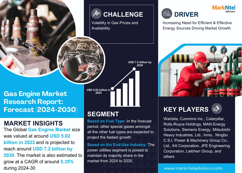 According to MarkNtel Advisors study The future of Global Gas Engine Market size was valued at around USD 5.02 billion in 2023 and is projected to reach around USD 7.2 billion by 2030. The market is also estimated to grow at a CAGR of around 5.35% during the forecast period, i.e., 2024-30.