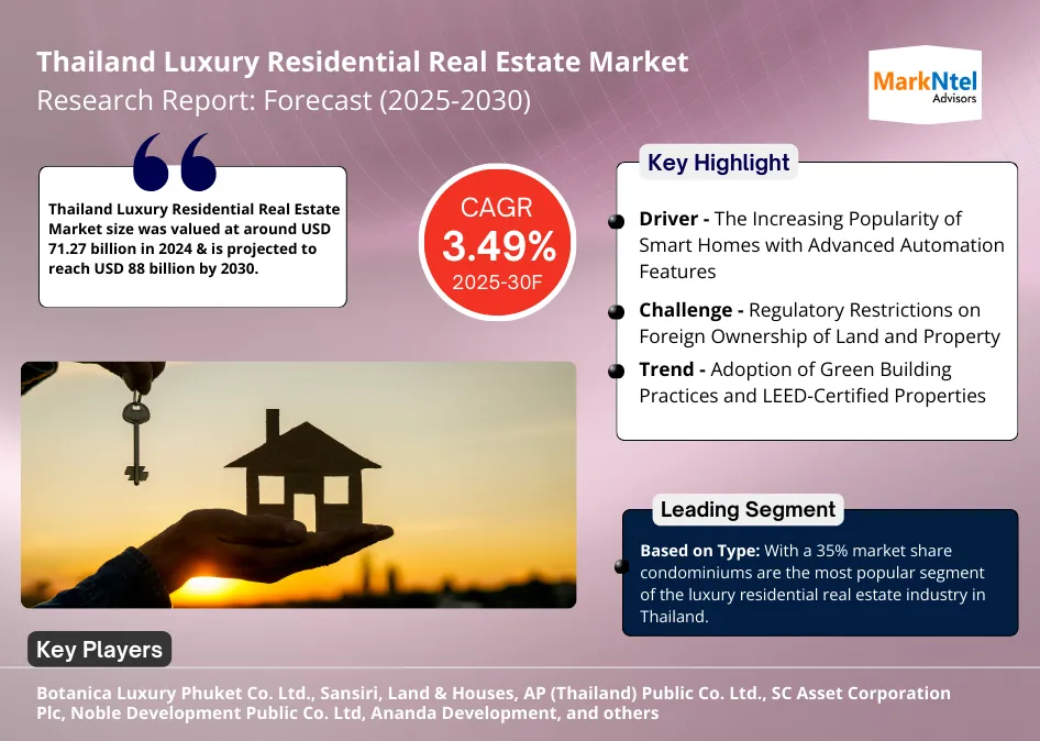 According to MarkNtel Advisors study The future of Thailand Luxury Residential Real Estate Market size was valued at around USD 71.27 billion in 2024 and is projected to reach USD 88 billion by 2030. Along with this, the market is estimated to grow at a CAGR of around 3.49% during the forecast period, i.e., 2025-30.