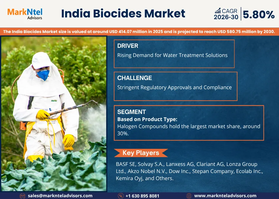 According to MarkNtel Advisors study The future of India Biocides Market size is valued at around USD 414.07 million in 2025 and is projected to reach USD 580.75 million by 2030. Along with this, the market is estimated to grow at a CAGR of around 5.80% during the forecast period, i.e., 2026-30.