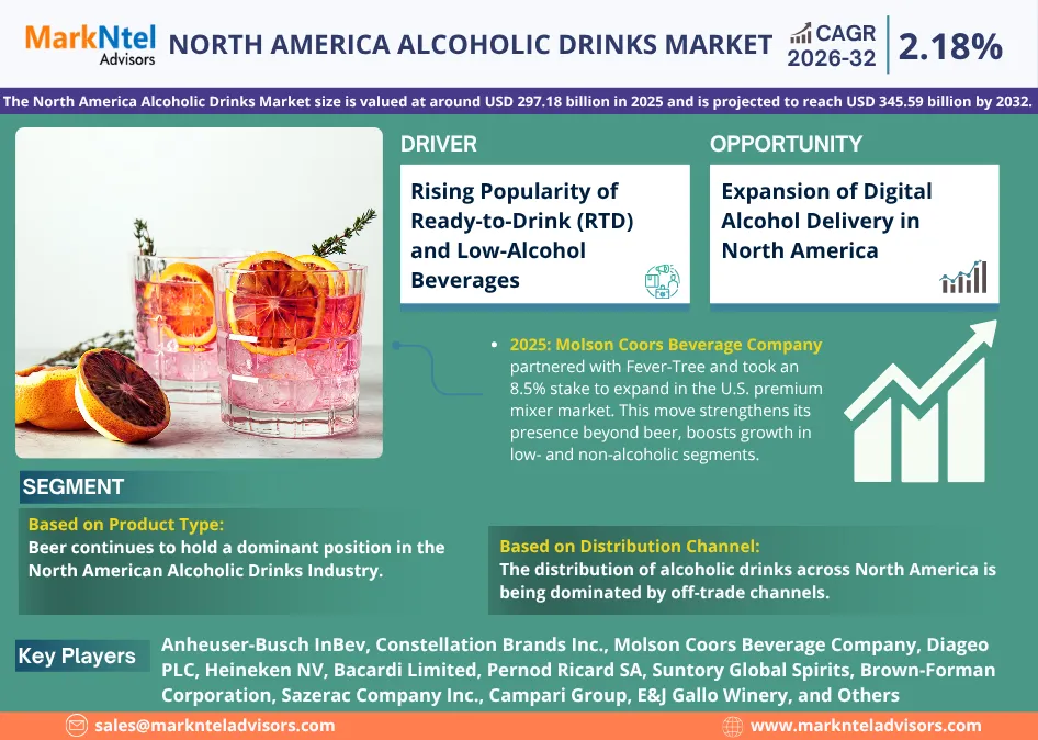According to MarkNtel Advisors study The future of North America Alcoholic Drinks Market size is valued at around USD 297.18 billion in 2025 and is projected to reach USD 345.59 billion by 2032. Along with this, the market is estimated to grow at a CAGR of around 2.18% during the forecast period, i.e., 2026-32.